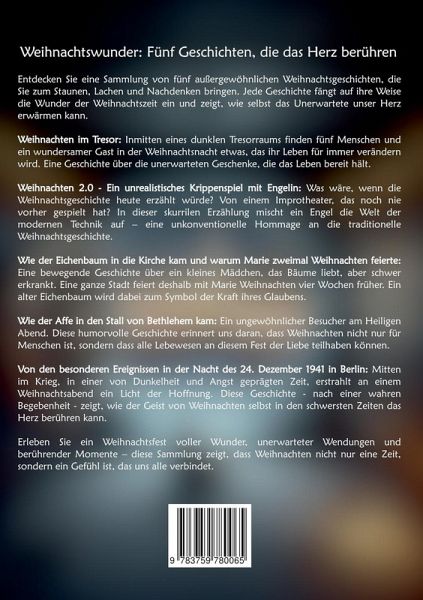 Weihnachtswunder: Fünf Geschichten, die das Herz berühren Entdecken Sie eine Sammlung von fünf außergewöhnlichen Weihnachtsgeschichten, die Sie zum Staunen, Lachen und Nachdenken bringen. Jede Geschichte fängt auf ihre Weise die Wunder der Weihnachtszeit ein und zeigt, wie selbst das Unerwartete unser Herz erwärmen kann. Weihnachten im Tresor: Inmitten eines dunklen Tresorraums finden fünf Menschen und ein wundersamer Gast in der Weihnachtsnacht etwas, das ihr Leben für immer verändern wird. Eine Geschichte über die unerwarteten Geschenke, die das Leben bereit hält. Weihnachten 2.0 - Ein unrealistisches Krippenspiel mit Engelin: Was wäre, wenn die Weihnachtsgeschichte heute erzählt würde? Von einem Improtheater, das noch nie vorher gespielt hat? In dieser skurrilen Erzählung mischt ein Engel die Welt der modernen Technik auf - eine unkonventionelle Hommage an die traditionelle Weihnachtsgeschichte. Wie der Eichenbaum in die Kirche kam und warum Marie zweimal Weihnachten feierte: Eine bewegende Geschichte über ein kleines Mädchen, das Bäume liebt, aber schwer erkrankt. Eine ganze Stadt feiert deshalb mit Marie Weihnachten vier Wochen früher. Ein alter Eichenbaum wird dabei zum Symbol der Kraft ihres Glaubens. Wie der Affe in den Stall von Bethlehem kam: Ein ungewöhnlicher Besucher am Heiligen Abend. Diese humorvolle Geschichte erinnert uns daran, dass Weihnachten nicht nur für Menschen ist, sondern dass alle Lebewesen an diesem Fest der Liebe teilhaben können. Von den besonderen Ereignissen in der Nacht des 24. Dezember 1941 in Berlin: Mitten im Krieg, in einer von Dunkelheit und Angst geprägten Zeit, erstrahlt an einem Weihnachtsabend ein Licht der Hoffnung. Diese Geschichte - nach einer wahren Begebenheit - zeigt, wie der Geist von Weihnachten selbst in den schwersten Zeiten das Herz berühren kann. Erleben Sie ein Weihnachtsfest voller Wunder, unerwarteter Wendungen und berührender Momente - diese Sammlung zeigt, dass Weihnachten nicht nur eine Zeit, sondern ein Gefühl ist, das uns alle verbindet.