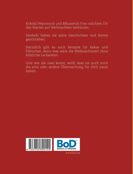 Kobold Nepomuck und Mäuserich Finn möchten Dir das Warten auf Weihnachten verkürzen.Deshalb haben sie extra Geschichten und Reime geschrieben.Natürlich gibt es auch Rezepte für Kekse und Plätzchen, denn was wäre die Weihnachtszeit ohne köstliche Leckereien.Und wer die zwei kennt, weiß, dass sie auch noch die eine oder andere Überraschung für Dich parat haben.
