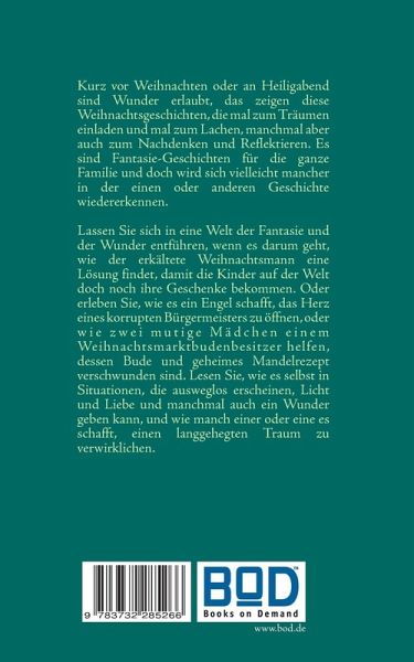 Kurz vor Weihnachten oder an Heiligabend sind Wunder erlaubt, das zeigen diese Weihnachtsgeschichten, die mal zum Träumen einladen und mal zum Lachen, manchmal aber auch zum Nachdenken und Reflektieren. Es sind Fantasie-Geschichten für die ganze Familie und doch wird sich vielleicht mancher in der einen oder anderen Geschichte wiedererkennen. Lassen Sie sich in eine Welt der Fantasie und der Wunder entführen, wenn es darum geht, wie der erkältete Weihnachtsmann eine Lösung findet, damit die Kinder auf der Welt doch noch ihre Geschenke bekommen. Oder erleben Sie, wie es ein Engel schafft, das Herz eines korrupten Bürgermeisters zu öffnen, oder wie zwei mutige Mädchen einem Weihnachtsmarktbudenbesitzer helfen, dessen Bude und geheimes Mandelrezept verschwunden sind. Lesen Sie, wie es selbst in Situationen, die ausweglos erscheinen, Licht und Liebe und manchmal auch ein Wunder geben kann, und wie manch einer oder eine es schafft, einen langgehegten Traum zu verwirklichen.