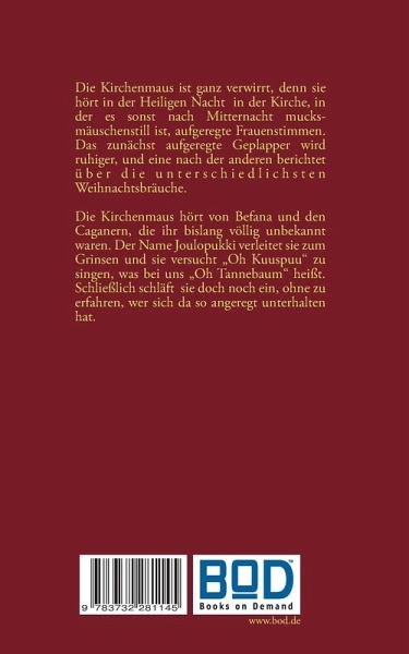 Die Kirchenmaus ist ganz verwirrt, denn sie hört in der Heiligen Nacht in der Kirche, in der es sonst nach Mitternacht mucksmäuschenstill ist, aufgeregte Frauenstimmen. Das zunächst aufgeregte Geplapper wird ruhiger, und eine nach der anderen berichtet über die unterschiedlichsten Weihnachtsbräuche. Die Kirchenmaus hört von Befana und den Caganern, die ihr bislang völlig unbekannt waren. Der Name Joulopukki verleitet sie zum Grinsen und sie versucht "Oh Kuuspuu" zu singen, was bei uns "Oh Tannenbaum" heißt. Schließlich schläft sie doch noch ein, ohne zu erfahren, wer sich da so angeregt unterhalten hat.