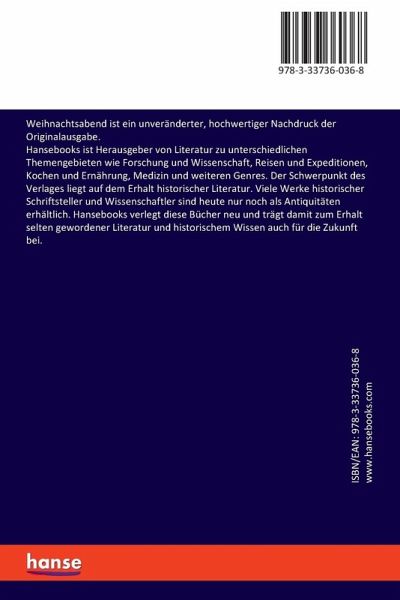 Weihnachtsabend ist ein unveränderter, hochwertiger Nachdruck der Originalausgabe.Hansebooks ist Herausgeber von Literatur zu unterschiedlichen Themengebieten wie Forschung und Wissenschaft, Reisen und Expeditionen, Kochen und Ernährung, Medizin und weiteren Genres. Der Schwerpunkt des Verlages liegt auf dem Erhalt historischer Literatur. Viele Werke historischer Schriftsteller und Wissenschaftler sind heute nur noch als Antiquitäten erhältlich. Hansebooks verlegt diese Bücher neu und trägt damit zum Erhalt selten gewordener Literatur und historischem Wissen auch für die Zukunft bei.