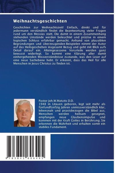 Geschichten zur Weihnachtszeit! Einfach, direkt und für jedermann verständlich findet die Beantwortung vieler Fragen rund um den Messias statt. Die damit in einem Zusammenhang stehenden Umstände werden beleuchtet und präzise in einem logischen Schluss erfahrbar gemacht. Anhand von plausiblen Begründungen und überzeugenden Beispielen nimmt der Autor auf das Heilsgeschehen insgesamt Bezug und geht mit Blick aufs Detail darauf ein. Alteingesessene Vorurteile werden ganz bewusst widerlegt. So kommt eine Klärung aller damit einhergehenden Missverständnisse zustande, was den Leser auf eine neue Sachebene hebt. Er erkennt, dass das Heil für alle Menschen in Jesus Christus zu finden ist.