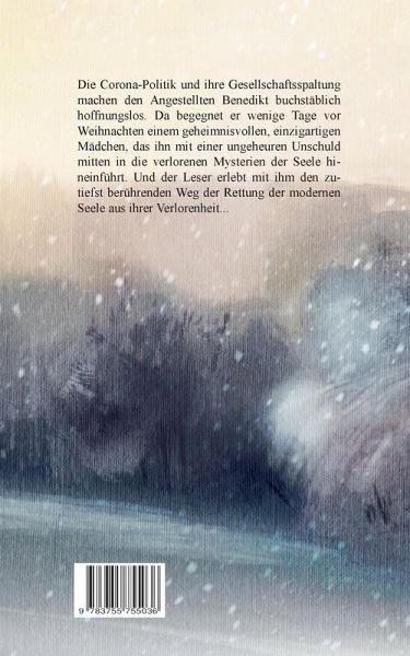 Die Corona-Politik und ihre Gesellschaftsspaltung machen den einfachen Angestellten Benedikt buchstäblich hoffnungslos. Da begegnet er wenige Tage vor Weihnachten einem geheimnisvollen, einzigartigen Mädchen, das ihn mit einer ungeheuren Unschuld mitten in die verlorenen Mysterien der Seele hineinführt. Und der Leser erlebt mit ihm den zutiefst berührenden Weg der Rettung der modernen Seele aus ihrer Verlorenheit...
