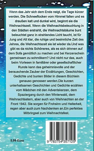 Wenn das Jahr sich dem Ende neigt, die Tage kürzer werde,. Die Schneeflocken vom Himmel fallen und es draußen kalt und dunkelt wird, beginnt sie die Weihnachtszeit. Wenn die Weihnachtsbeleuchtung in den Städten erstrahlt, die Weihnachtsbäume bunt beleuchtet ganz in strahlendes Licht taucht, ist für Jung und Alt klar, die ruhige und besinnliche Zeit des Jahres, die Weihnachtszeit ist wieder da. Und was gibt es da nichts Schöneres, als es sich drinnen auf dem Sofa gemütlich zu machen und bei Kerzenschein gemeinsam zu schmökern? Und nicht nur das, auch beim Vorlesen in familiärere oder gesellschaftlicher Runde kann das geheimnisvolle und der berauschende Zauber der Erzählungen, Geschichten, Gedichte und bunten Bildern in diesem Büchlein genauso genossen werden. Die kurzen unterhaltsamen Geschichten und Gedichte erzählen unter anderem vom Mädchen mit den Adventskerzen, dem Spaziergang durch den Winterwald, dem Weihnachtsstern, aber auch von Weihnachten an der Front 1942. Sie sorgen für Frohsinn und Heiterkeit, regen aber auch zum Nachdenken an. Ein perfektes Mitbringsel zum Weihnachtsfest.