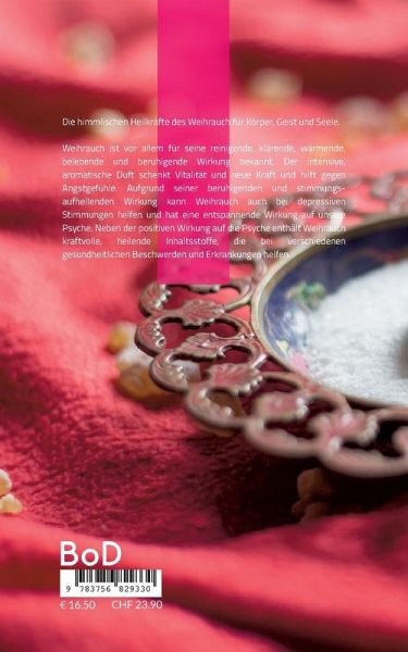 Die himmlischen Heilkräfte des Weihrauch für Körper, Geist und Seele.Weihrauch ist vor allem für seine reinigende, klärende, wärmende, belebende und beruhigende Wirkung bekannt. Der intensive, aromatische Duft schenkt Vitalität und neue Kraft und hilft gegen Angstgefühle. Aufgrund seiner beruhigenden und stimmungsaufhellenden Wirkung kann Weihrauch auch bei depressiven Stimmungen helfen und hat eine entspannende Wirkung auf unsere Psyche. Neben der positiven Wirkung auf die Psyche enthält Weihrauch kraftvolle, heilende Inhaltsstoffe, die bei verschiedenen gesundheitlichen Beschwerden und Erkrankungen helfen.