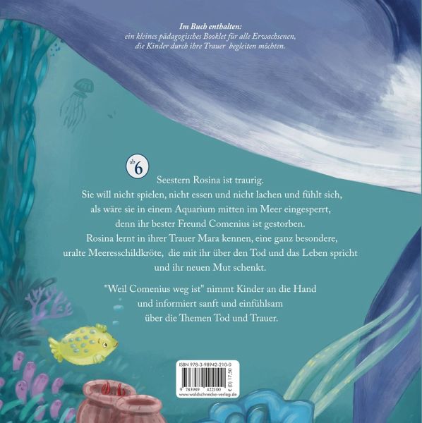 Seestern Rosina ist traurig. Sie will nicht spielen, nicht essen und nicht lachen und fühlt sich, als wäre sie in einem Aquarium mitten im Meer eingesperrt, denn ihr bester Freund Comenius ist gestorben. Rosina lernt in ihrer Trauer Mara kennen, eine ganz besondere, uralte Meeresschildkröte, die mit ihr über den Tod und das Leben spricht und ihr neuen Mut schenkt."Weil Comenius weg ist" nimmt Kinder an die Hand und informiert sanft und einfühlsam über die Themen Tod und Trauer.