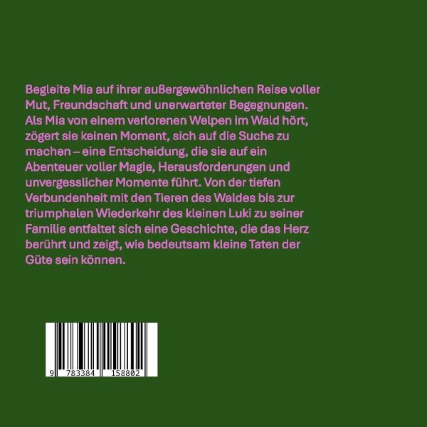 Das Herz von Mia" ist eine herzerwärmende Erzählung über die Reise eines jungen Mädchens und ihres vierbeinigen Begleiters. Als Mia erfährt, dass ein kleiner Welpe im großen, geheimnisvollen Wald verloren gegangen ist, beginnt sie eine Rettungsmission, die zu einer tiefgreifenden Entdeckung von Freundschaft, Mut und der unerschütterlichen Kraft der Gemeinschaft wird. Auf ihrem Weg begegnen Mia und Luki, der kleine, mutige Welpe, einer Vielzahl von Waldtieren, die ihnen dabei helfen, Herausforderungen zu meistern und das Unmögliche möglich zu machen.