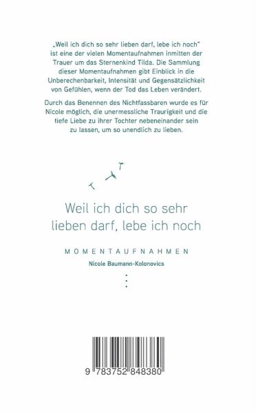 "Weil ich dich so sehr lieben darf, lebe ich noch" ist eine der vielen Momentaufnahmen inmitten der Trauer um das Sternenkind Tilda. Die Sammlung dieser Momentaufnahmen gibt Einblick in die Unberechenbarkeit, Intensität und Gegensätzlichkeit von Gefühlen, wenn der Tod das Leben verändert.Durch das Benennen des Nichtfassbaren wurde es für Nicole möglich, die unermessliche Traurigkeit und die tiefe Liebe zu ihrer Tochter nebeneinander sein zu lassen, um so unendlich zu lieben.
