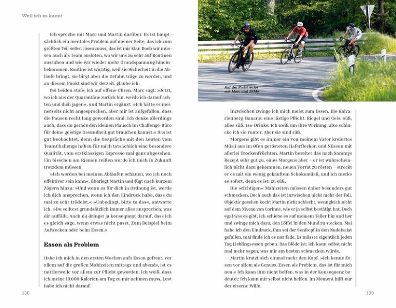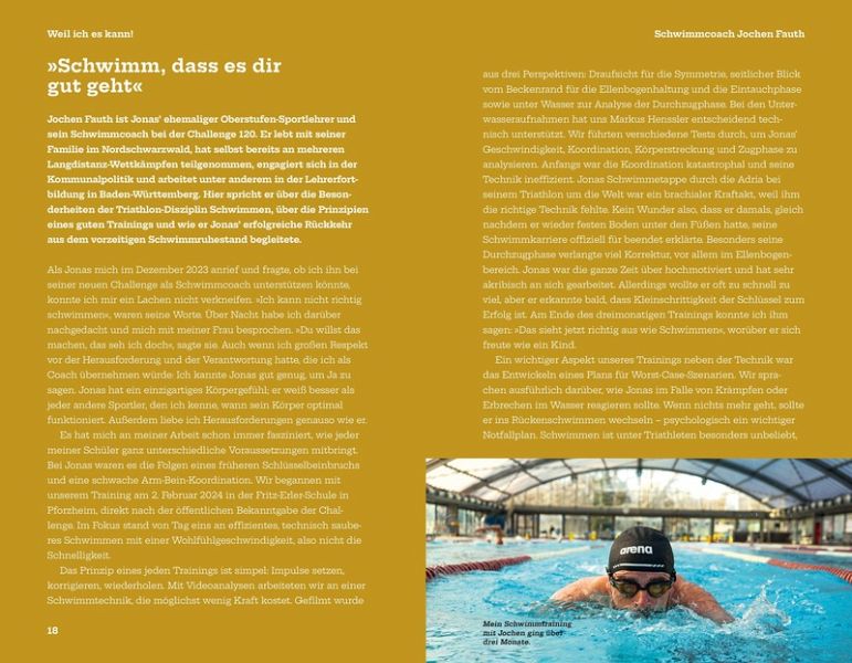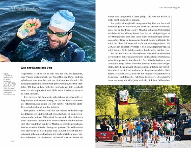 Jonas Deichmann: "Der Extreme unter den Extremsportlern" (ZDF) und sein bisher außergewöhnlichster WeltrekordJonas Deichmanns Challenge 120 durch den Triathlonlandkreis Roth ist nicht nur ein sportliches Ereignis, sondern ein kaum vorstellbares Abenteuer, eine Ausdauerleistung "jenseits des Denkbaren" (Dr. med. Bernd Langenstein). Mehrere Weltrekorde hat der Abenteurer und Ausnahmesportler bereits aufgestellt, darunter die schnellste Durchquerung Eurasiens auf dem Fahrrad von West nach Ost (2017), die schnellste Fahrt auf der Panamericana von Nord nach Süd (2018), die schnellste Fahrt vom Nordkap zum Kap der Guten Hoffnung (2019) und vor allem die erste Weltumrundung im Triathlon (2020/21). Letztere umfasste ebenfalls 120 Langdistanzen, die Jonas Deichmann innerhalb von 14 Monaten vollendete.Challenge 120 ist jedoch eine besondere Herausforderung: Innerhalb von 120 Tagen wird Jonas Deichmann auf der Originalstrecke des weltberühmten "Challenge Roth" 120 Langdistanz-Triathlons bewältigen. Das bedeutet 120-mal 3,8 km Schwimmen, 120-mal 180 km Radfahren und 120-mal einen Marathonlauf von 42,2 km - Tag für Tag. Die Challenge 120 beginnt am 9.5.2024 und endet mit der 120. Triathlon-Langdistanz am 5.9.2024. Der Weltrekord, den der Brite Sean Conway 2023 aufgestellt hat, liegt bei 105 Tagen, d.h., am 22.08.2024, Tag 106, wird Jonas Deichmann diesen Rekord gebrochen haben. Danach sind es noch zwei Wochen bis zum Finale. Die Magie von RothDas bei Nürnberg gelegene Städtchen Roth ist seit 40 Jahre ein Mekka für Triathlon-Enthusiasten aus aller Welt. Der legendäre DATEV Challenge Roth zieht jedes Jahr Tausende Athleten und Hunderttausende Zuschauer an und ist bekannt für seine begeisternde Atmosphäre. Diese Begeisterung überträgt sich auch auf Jonas Deichmanns Challenge 120. Jeden Tag feuern ihn viele Zuschauer an der Strecke an und jubeln ihm im Ziel zu, außerdem hat er stets Begleitung von anderen ambitionierten Sportlern, die mit ihm schwimmen, Rad fahren und laufen oder sogar die gesamte Langdistanz mitmachen.Inspiration und MotivationJonas Deichmann ist nicht nur ein Sportler, sondern auch eine Inspirationsquelle für kleine und große Menschen. Seine Abenteuer und seine Fähigkeit, scheinbar unüberwindbare Hindernisse zu meistern, motivieren Menschen weltweit, ihre eigenen Träume zu verwirklichen und niemals aufzugeben. Jeden Tag ermuntert er die Menschen um ihn herum, sich aus ihrer Komfortzone herauszubewegen und die eigenen Grenzen zu verschieben. Das Buch erzählt diese inspirierenden Geschichten und zeigt den Lesern, dass man mit Entschlossenheit und Enthusiasmus viel mehr erreichen kann, als man sich träumen ließ.Hinter den Kulissen: Planung und DurchführungDie logistischen und organisatorischen Herausforderungen einer solchen Unternehmung sind immens. Von der akribischen Planung über die Sicherstellung ausreichender Ernährung und medizinischer Versorgung bis hin zur Bewältigung unvorhergesehener Hindernisse - dieses Buch bietet einen exklusiven Blick hinter die Kulissen der Challenge 120. Es zeigt, wie ein kleines Betreuerteam, ergänzt durch medizinische und physiotherapeutische Unterstützung, im Hintergrund dazu beiträgt, das Unmögliche möglich zu machen. Ein leuchtendes Beispiel dafür, wie wichtig Teamarbeit und Vorbereitung für den Erfolg einer solchen extremen Herausforderung sind, und wie selbst scheinbar belanglose Einzelheiten das Ganze in Gefahr bringen können, wenn sie nicht funktionieren.Das Buch über diese "Triathlon-Reise" am Stück führt die Leser in die physischen und mentalen Extreme, denen sich Deichmann aussetzt, und zeigt auf, was es wirklich bedeutet, die eigenen Grenzen zu überwinden. Ein Buch über Jonas Deichmanns "größtes Duell gegen sich selbst" (ZDF).Mit rund 100 authentischen Fotografien wird diese Challenge auch optisch hautnah erlebbar.