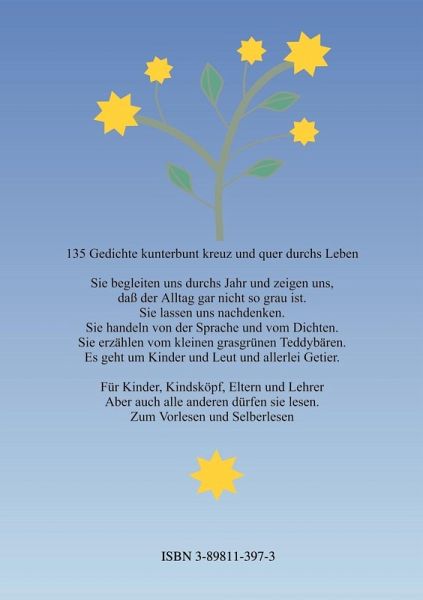 135 Gedichte kunterbunt kreuz und quer durchs Leben. Sie begleiten uns durchs Jahr und zeigen uns, daß der Alltag gar nicht so grau ist. Sie lassen uns nachdenken. Sie handeln von der Sprache und vom Dichten. Sie erzählen vom kleinen grasgrünen Teddybären. Es geht um Kinder und Leut und allerlei Getier. Für Kinder, Kindsköpf, Eltern und Lehrer. Aber auch alle anderen dürfen sie lesen. Zum Vorlesen und Selberlesen.