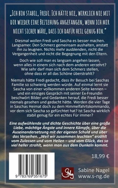 "Ich bin stabil, Fredi. Ich hätte nie, wirklich nie mit dir wieder eine Beziehung angefangen, wenn ich mir nicht sicher wäre, dass ich dafür heil genug bin." Diesmal wollen Fredi und Sascha es besser machen. Langsamer. Den Schmerz gemeinsam aushalten, anstatt ihn zu leugnen. Nichts mehr ausblenden, nicht die Vergangenheit und nicht die Begegnung mit den Eltern. Doch wie soll man es langsam angehen lassen, wenn alles in einem sich nach dem anderen verzehrt? Wie sehr darf man sich dem Schmerz stellen, ohne dass er all das Schöne überstrahlt? Niemals hätte Fredi gedacht, dass ihr Besuch bei Saschas Familie so schwierig werden würde. Auf einmal lernt sie Sascha von einer vollkommen anderen Seite kennen - und ein einziges Gespräch mit seiner Ex-Freundin beschwört Bilder und Gedanken herauf, die Fredi besser niemals gesehen und gedacht hätte. Werden die vier Tage in Saschas Heimat doch zu dem Himmelfahrtskommando, vor dem sich Sascha so gefürchtet hat? Ist Sascha wirklich stabil genug für ein echtes Für immer? Eine aufwühlende und dichte Geschichte über eine große Liebe, mächtige Ängste und innere Kämpfe, über die Auseinandersetzung mit der eigenen Schuld und über das Verzeihen. "Weil wir zusammen leuchten" erzählt vom Zulassen und vom Heilen - und vom Glück, das so viel heller strahlt, wenn man aus dem Dunkeln kommt.