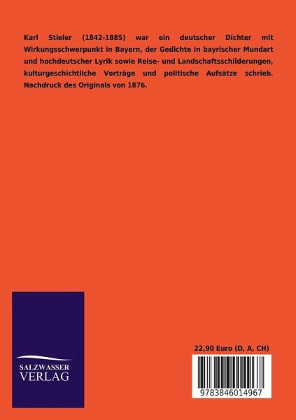 Karl Stieler (1842-1885) war ein deutscher Dichter mit Wirkungsschwerpunkt in Bayern, der Gedichte in bayrischer Mundart und hochdeutscher Lyrik sowie Reise- und Landschaftsschilderungen, kulturgeschichtliche Vorträge und politische Aufsätze schrieb. Nachdruck des Originals von 1876.