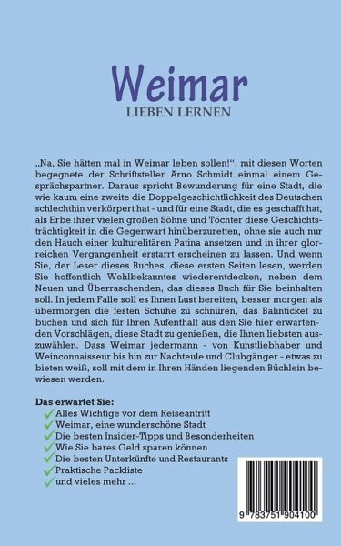 ,,Na, Sie hätten mal in Weimar leben sollen!'', mit diesen Worten begegnete der Schriftsteller Arno Schmidt einmal einem Gesprächspartner. Daraus spricht Bewunderung für eine Stadt, die wie kaum eine zweite die Doppelgeschichtlichkeit des Deutschen schlechthin verkörpert hat - und für eine Stadt, die es geschafft hat, als Erbe ihrer vielen großen Söhne und Töchter diese Geschichtsträchtigkeit in die Gegenwart hinüberzuretten, ohne sie auch nur den Hauch einer kulturelitären Patina ansetzen und in ihrer glorreichen Vergangenheit erstarrt erscheinen zu lassen. Und wenn Sie, der Leser dieses Buches, diese ersten Seiten lesen, werden Sie hoffentlich Wohlbekanntes wiederentdecken, neben dem Neuen und Überraschenden, das dieses Buch für Sie beinhalten soll. In jedem Falle soll es Ihnen Lust bereiten, besser morgen als übermorgen die festen Schuhe zu schnüren, das Bahnticket zu buchen und sich für Ihren Aufenthalt aus den Sie hier erwarten-den Vorschlägen, diese Stadt zu genießen, die Ihnen liebsten auszuwählen. Dass Weimar jedermann - von Kunstliebhaber und Weinconnaisseur bis hin zur Nachteule und Clubgänger - etwas zu bieten weiß, soll mit dem in Ihren Händen liegenden Büchlein bewiesen werden.Das erwartet Sie:-Alles Wichtige vor dem Reiseantritt-Weimar, eine wunderschöne Stadt-Die besten Insider-Tipps und Besonderheiten-Wie Sie bares Geld sparen können-Die besten Unterkünfte und Restaurants-Praktische Packliste-und vieles mehr ...