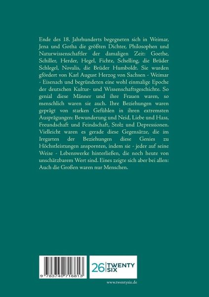 Ende des 18. Jahrhunderts begegneten sich in Weimar, Jena und Gotha die größten Dichter, Philosophen und Naturwissenschaftler der damaligen Zeit: Goethe, Schiller, Herder, Hegel, Fichte, Schelling, die Brüder Schlegel, Novalis, die Brüder Humboldt. Sie wurden gefördert von Karl August Herzog von Sachsen - Weimar - Eisenach und begründeten eine wohl einmalige Epoche der deutschen Kultur- und Wissenschaftsgeschichte. So genial diese Männer und ihre Frauen waren, so menschlich waren sie auch. Ihre Beziehungen waren geprägt von starken Gefühlen in ihren extremsten Ausprägungen: Bewunderung und Neid, Liebe und Hass, Freundschaft und Feindschaft, Stolz und Depressionen. Vielleicht waren es gerade diese Gegensätze, die im Irrgarten der Beziehungen diese Genies zu Höchstleistungen anspornten, indem sie - jeder auf seine Weise - Lebenswerke hinterließen, die noch heute von unschätzbarem Wert sind. Eines zeigte sich aber bei allen: Auch die Großen waren nur Menschen.