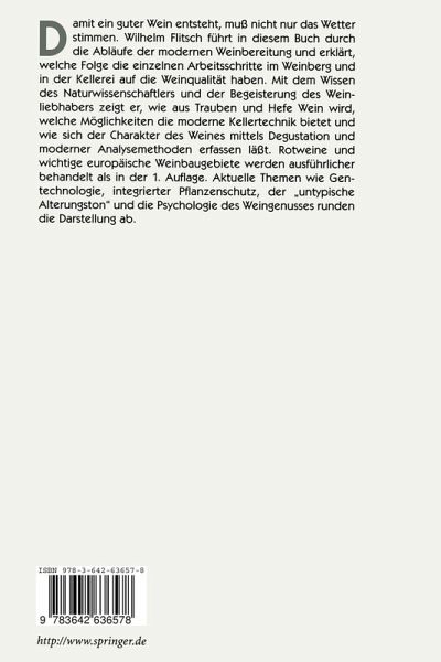 Damit ein guter Wein entsteht, muß nicht nur das Wetter stimmen. Wilhelm Flitsch führt in diesem Buch durch die Abläufe der modernen Weinbereitung und erklärt, welche Folge die einzelnen Arbeitsschritte im Weinberg und in der Kellerei auf die Weinqualität haben. Mit dem Wissen des Naturwissenschaftlers und der Begeisterung des Weinliebhabers zeigt er, wie aus Trauben und Hefe Wein wird, welche Möglichkeiten die moderne Kellertechnik bietet und wie sich der Charakter des Weines mittels Degustation und moderner Analysemethoden erfassen läßt. Rotweine und wichtige europäische Weinbaugebiete werden ausführlicher behandelt als in der 1. Auflage. Aktuelle Themen wie Gentechnologie, integrierter Pflanzenschutz, der "untypische Alterungston" und die Psychologie des Weingenusses runden die Darstellung ab.