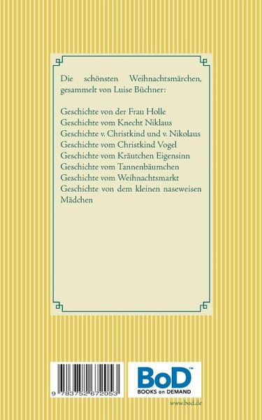 Die schönsten Weihnachtsmärchen, gesammelt von Luise Büchner:Die Geschichte von der Frau HolleDie Geschichte vom Knecht NiklausDie Geschichte vom Christkind und vom NikolausDie Geschichte vom Christkind-VogelDie Geschichte vom Kräutchen EigensinnDie Geschichte vom TannenbäumchenDie Geschichte vom kleinen naseweisen MädchenDie Geschichte vom Weihnachtsmarkt
