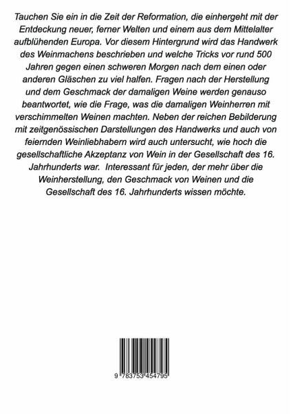In der kurzweiligen Veröffentlichung "Weinanbau in der Renaissance" wird jeder Schritt der Weinherstellung vom Anbau bis zu dessen Genuss im Licht des 16. Jahrhunderts betrachtet und mit zeitgenössischen Abbildungen erklärt. Der Inhalt fußt auf dem Wissen von Originalpublikationen aus dieser Zeit, die entsprechend zitiert werden und ein weiteres Studium der Materie ermöglichen. Weiterhin wird die Trinkkultur und gesellschaftliche Akzeptanz des Weinkonsums in dieser Epoche angerissen. Mittels Zitate und Darstellungen entsteht ein möglichst authentischer Eindruck, wie Weine zu dieser Zeit hergestellt wurden und welcher Geschmack bevorzugt wurde. Beschreibung auf dem Buchhinterdeckel: Tauchen Sie ein in die Zeit der Reformation, die einhergeht mit der Entdeckung neuer, ferner Welten und einem aus dem Mittelalter aufblühenden Europa. Vor diesem Hintergrund wird das Handwerk des Weinmachens beschrieben und welche Tricks vor rund 500 Jahren gegen einen schweren Morgen nach dem einen oder anderen Gläschen zu viel halfen. Fragen nach der Herstellung und dem Geschmack der damaligen Weine werden genauso beantwortet, wie die Frage, was die damaligen Weinherren mit verschimmelten Weinen machten. Neben der reichen Bebilderung mit zeitgenössischen Darstellungen des Handwerks und auch von feiernden Weinliebhabern wird auch untersucht, wie hoch die gesellschaftliche Akzeptanz von Wein in der Gesellschaft des 16. Jahrhunderts war. Interessant für jeden, der mehr über die Weinherstellung, den Geschmack von Weinen und die Gesellschaft des 16. Jahrhunderts wissen möchte.