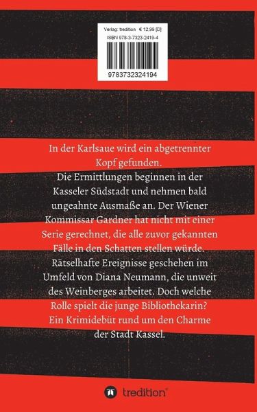 Regionaler Krimi aus NordhessenIn der Karlsaue wird ein abgetrennter Kopf gefunden. Die Ermittlungen beginnen in der Kasseler Südstadt und nehmen bald ungeahnte Ausmaße an. Der Wiener Kommissar Gardner hat nicht mit einer Serie gerechnet, die alle zuvor gekannten Fälle in den Schatten stellen würde. Rätselhafte Ereignisse geschehen im Umfeld von Diana Neumann, die unweit des Weinberges arbeitet. Doch welche Rolle spielt die junge Bibliothekarin? Ein Krimidebüt rund um den Charme der Stadt Kassel.