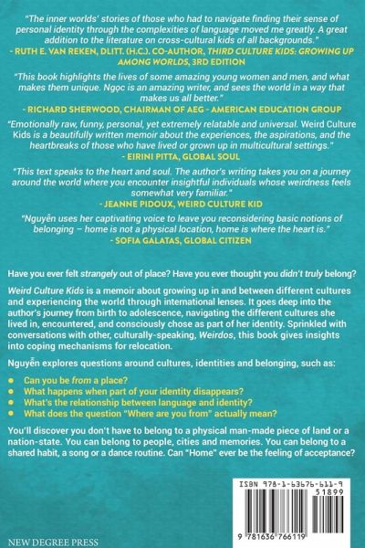 Have you ever felt strangely out of place? Have you ever thought you didn't truly belong? Weird Culture Kids is a memoir about growing up in and between different cultures and experiencing the world through international lenses. It goes deep into the author's journey from birth to adolescence, navigating the different cultures she lived in, encountered, and consciously chose as part of her identity. Sprinkled with conversations with other, culturally-speaking, Weirdos, this book gives insights into coping mechanisms for relocation. Nguy¿n explores questions around cultures, identities and belonging, such as: Can you be from a place? What happens when part of your identity disappears? What's the relationship between language and identity? What does the question "Where are you from" actually mean? You'll discover you don't have to belong to a physical man-made piece of land or a nation-state. You can belong to people, cities and memories. You can belong to a shared habit, a song or a dance routine. Can "Home" ever be the feeling of acceptance?