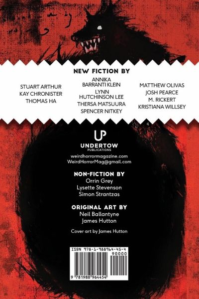 Strange and startling new fiction from Stuart Arthur, Kay Chronister, Thomas Ha, Annika Barranti Klein, Lynn Hutchinson Lee, Thersa Matsuura, Spencer Nitkey, M.M. Olivas, Josh Pearce, M. Rickert, and Kristiana Willsey. Plus opinion, reviews, and commentary from Simon Strantzas, Orrin Grey, and Lysette Stevenson. "Excellent!" -Ellen Datlow, The Best Horror of the Year