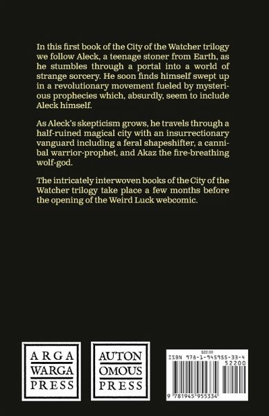 This is the reissue of the long out-of-print Weird Luck in the City of the Watcher, originally written in 2003 and published in 2012. The intricately interwoven books of the City of the Watcher trilogy take place a few months before the opening of the Weird Luck webcomic. In this first book we follow Aleck, a teenage stoner from Earth, as he stumbles through a portal into a world of strange sorcery. He soon finds himself swept up in a revolutionary movement fueled by mysterious prophecies which, absurdly, seem to include Aleck himself. As Aleck's skepticism grows, he travels through a half-ruined magical city with an insurrectionary vanguard including a feral shapeshifter, a cannibal warrior-prophet, and Akaz the fire-breathing wolf-god. Their adventures lead to an explosive climax, which we revisit in books two and three of the trilogy, showing the events from wildly different points of view, each retroactively revising the reader's impressions of the last.
