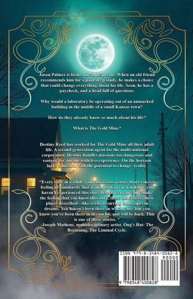 Jason Palmer is broke, tired, desperate. When an old friend recommends him for a paid sleep study, he makes a choice that could change everything about his life. Soon, he has a paycheck, and a head full of questions.Why would a laboratory be operating out of an unmarked building in the middle of a small Kansas town?How do they already know so much about his life?What is The Gold Mine?Destiny Reed has worked for The Gold Mine all their adult life. A second-generation agent for the multi-national corporation, Destiny handles missions too dangerous and esoteric for anyone with less experience. On the horizon lurks a mission with the potential to change reality."Every once in a while, you run across a story that evokes a feeling of familiarity that is akin to deja vu. You know you haven't experienced this story before, yet you can't shake the feeling that you know this story, these characters, these places described-like eerily recurring landscapes in dreams. You haven't been there in waking life, but you know you've been there in dream life and will be back. This is one of those stories."-Joseph Matheny, multidisciplinary artist. Ong's Hat: The Beginning, The Liminal Cycle.