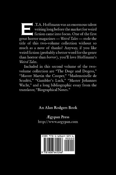 E.T.A. Hoffmann was an enormous talent writing long before the market for weird fiction came into focus. One of the first great horror magazines -- Weird Tales -- stole the title of this two-volume collection without so much as a note of thanks! Anyway, if you like weird fiction (probably a better word for the genre than horror), you'll love Hoffmann's Weird Tales.