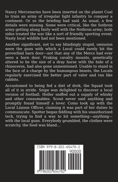 Nancy Mercenaries have been inserted on the planet Coal to train an army of irregular light infantry to conquer a continent. Or so the briefing had said. As usual, a few details were missing. Some were critical, like the Sothron army getting along fairly well with the Nothron army; both sides treated the war like a sort of friendly sporting event. Nasty local wildlife had not been mentioned. Another significant, not to say blindingly stupid, omission were the guns with which a Local could rarely hit the proverbial barn door-not that any of the Mercs had ever seen a barn door. Fraking cavalry mounts, genetically altered to be the size of a dray horse with the hide of a rhinoceros, had also gone unmentioned. Unable to stand in the face of a charge by the humungous beasts, the Locals regularly exercised the better part of valor and ran like rabbits. Accustomed to being fed a diet of drek, the Squad took all of it in stride. Snipe was delighted to discover a local version of football. Holler sniffed out a supply of whisky and other consumables. Scout never said anything and promptly found himself a lover. Coms took up with the Local Liaison Officer, claiming it was part of her duties to communicate. Spotter began fiddling with his unauthorized tech, trying to find a way to hit something-anything- with the local guns. Everybody grumbled, the clothes were scratchy, the food was bland... Ani, Leader of the ten Merc Squad, paid the usual complaints no mind, except for Point's; she feared the truth of his gloomy predictions about getting an army of light infantry out of its nice, safe, defensive positions so they could invade a continent they did not want- Ani wondered who had dreamt up this mission.