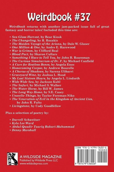 Weirdbook returns with another jam-packed issue full of great fantasy and horror tales! Included this time are: • Sea Glass Harvest, by Bear Kiosk • The Changeling, by R. Rozakis • The Maiden Voyage of the Ariona, by Dale W. Glaser • One Million & One, by Andre E. Harewood • War is Grimm, by Clifford Beal • Blood Pact, by Sharon Cullars • Something I Have to Tell You, by John B. Rosenman • The Curious Simulacrum of Dr. F, by Michael Canfield • A Cure for Restless Bones, by Angela Enos • Homecoming Corpse, by Andrew Bourelle • A Chorus of Shadows, by Sarena Ulibarri • Graveyard Wine, by Joshua L. Hood • My Last Sixteen Hours, by Angela L. Lindseth • Wide Wide Sea, by Jackson Kuhl • The Safari, by Michael S. Walker • The Water Horse, by Bill W. James • The Long Way Home, by S.E. Casey • Unseelie Things, by Taylor Foreman-Niko • The Veneration of Evil in the Kingdom of Ancient Lies, by John R. Fultz • Livingstone, by Cody Goodfellow Plus a selection of poetry by: • Darrell Schweitzer • Kyla Lee Ward • Abdul-Qaadir Taariq Bakari-Muhammad • Denny Marshall