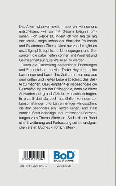 Das Altern ist unvermeidlich, aber wir können uns entscheiden, wie wir mit diesem Ereignis umgehen. "Ich werde alt, indem ich von Tag zu Tag dazulerne", sagte schon der römische Philosoph und Staatsmann Cicero. Nicht nur von ihm gibt es unzählige philosophische Überlegungen und Gedanken, die dabei helfen können, mit Weisheit und Gelassenheit auf gute Weise alt zu werden.Durch die Darstellung persönlicher Erfahrungen und Erkenntnisse motiviert Dieter Heymann seine Leserinnen und Leser, ihre Zeit zu nutzen und aus dem dritten und vierten Lebensabschnitt das Beste zu machen. Dazu empfi ehlt er insbesondere dieBeschäftigung mit der Philosophie, denn sie bietet Antworten auf grundsätzliche Menschheitsfragen. Er erzählt deshalb auch ausführlich von den Lebensumständen und Lehren einiger Philosophen, die ihm besonders am Herzen liegen, und stellt damit äußerst vielseitige und umfassende Betrachtungen zum Thema Altern an. So ist dieser Band eine Erweiterung und Fortsetzung seines erfolgreichen ersten Buches "Fröhlich altern".