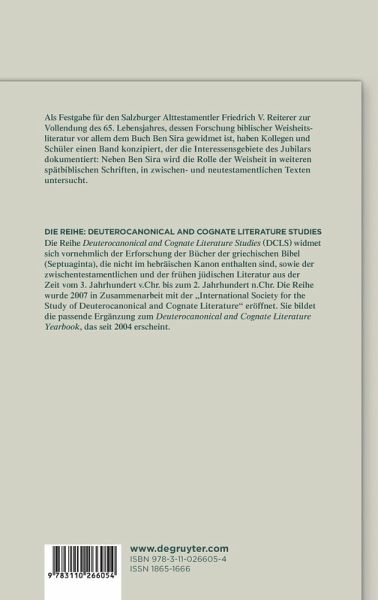 Als Festgabe für den Salzburger Alttestamentler Friedrich V. Reiterer zur Vollendung des 65. Lebensjahres, dessen Forschung biblischer Weisheitsliteratur vor allem dem Buch Ben Sira gewidmet ist, überreichen Kollegen und Schüler einen Strauß von Untersuchungen, die die Interessengebiete des Jubilars beleuchten: Neben Ben Sira wird die Rolle der Weisheit in weiteren spätbiblischen Schriften, in zwischen- und neutestamentlichen Texten untersucht. Die einzelnen exegetisch-theologisch-philogischen Beiträge des Bandes stehen unter dem Motto "Kommt zu mir ... sättigt euch an meinen Früchten" (Sir 24,19).