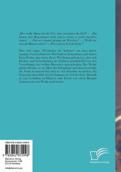 Dies sind einige Weisheiten der Indianer aus dem gleichnamigen Taschenbuch des Wiesbadener Journalisten und Autors Ernst Probst. Aus vielen dieser Weisheiten geht hervor, dass sich Denken und Lebenshaltung der Indianer grundsätzlich von den Vorstellungen der weißen Menschen unterscheiden. Der Weiße glaubt offenbar, er sei Herr der Schöpfung und dazu berechtigt, die Natur zu unterwerfen und sie sich dienstbar zu machen. Im Gegensatz dazu fühlt sich der Indianer als Teil der Erde. Deshalb ist sein Verhältnis zu Pflanzen und Tieren von einem Respekt bestimmt, den der Weiße nicht besitzt.