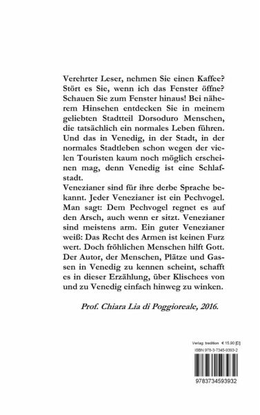 Die Touristenschlafstadt Venedig wäre, soweit es die Bewohner betrifft, tot, gäbe es nicht den auf einem Felsen gebauten, lebhaften Stadtteil Dorsoduro, wo die Menschen bei näherem Hinsehen noch ein normales Leben führen. Einheimische aus dem Dorsoduro sind Pechvögel. Sie sind für ihre derbe Sprache bekannt. Für zwei dieser Pechvögel sind weitreichende Begegnungen, Liebesbeziehungen zu Juliette, einer jungen Französin aus dem 13. Arrondissement in Paris, Schicksal. Man sagt in Venedig: Dem Pechvogel regnet es auf den Arsch, auch wenn er sitzt. Bewohner im Dorsoduro sind meistens arm. Ein guter Mensch dort weiß: Das Recht des Armen ist keinen Furz wert. Doch fröhlichen Menschen hilft Gott! Der Autor, der Menschen, Plätze und Gassen in Venedig kennt, schafft es in dieser Erzählung, über Klischees von und zu Venedig einfach hinweg zu winken.