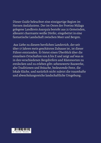 Dieser praktische Guide bietet eine Übersicht über die 31 Gemeinden des Landkreises Axarquía, der sich im Osten der Provinz Málaga, im Herzen Andalusiens befindet. Es wird aufgezeigt, was es in den einzelnen weißen Dörfern zwischen Meer und Bergen zu sehen und zu erleben gibt. Über sehenswerte Bauwerke, Traditionen und Bräuche wird ebenso berichtet, wie über bedeutende Feste, die lokale Küche, und nicht zuletzt über die traumhafte und abwechslungsreiche landschaftliche Umgebung. Der Guide ist interessant für alle, die Málaga und die Region Axarquía bereisen wollen, für diejenigen, die bereits hier leben und diesen Landstrich näher erkunden möchten, sowie für alle Liebhaber Andalusiens.Die Autorin lebt selbst seit über 17 Jahren mitten in der Axarquía. Mit diesem Buch möchte sie dem Leser diesen einzigartigen Landstrich näher bringen.
