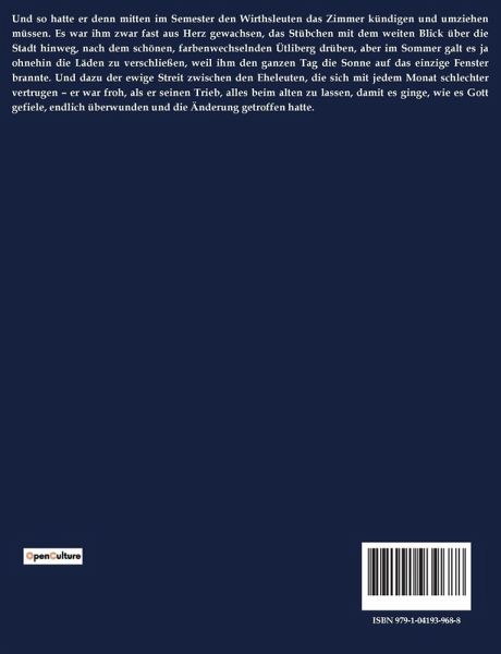 Und so hatte er denn mitten im Semester den Wirthsleuten das Zimmer kündigen und umziehen müssen. Es war ihm zwar fast aus Herz gewachsen, das Stübchen mit dem weiten Blick über die Stadt hinweg, nach dem schönen, farbenwechselnden Ütliberg drüben, aber im Sommer galt es ja ohnehin die Läden zu verschließen, weil ihm den ganzen Tag die Sonne auf das einzige Fenster brannte. Und dazu der ewige Streit zwischen den Eheleuten, die sich mit jedem Monat schlechter vertrugen ¿ er war froh, als er seinen Trieb, alles beim alten zu lassen, damit es ginge, wie es Gott gefiele, endlich überwunden und die Änderung getroffen hatte.