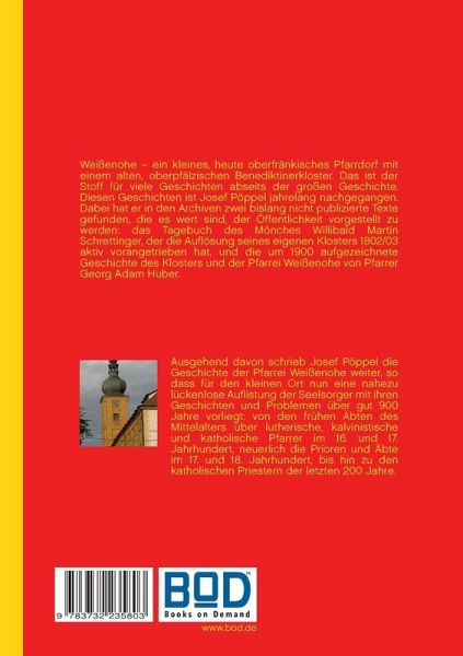 Weißenohe - ein kleines, heute oberfränkisches Pfarrdorf mit einem alten, oberpfälzischen Benediktinerkloster. Das ist der Stoff für viele Geschichten abseits der großen Geschichte. Diesen Geschichten ist Josef Pöppel jahrelang nachgegangen. Dabei hat er in den Archiven zwei bislang nicht publizierte Texte gefunden, die es wert sind, der Öffentlichkeit vorgestellt zu werden: das Tagebuch des Mönches Willibald Martin Schrettinger, der die Auflösung seines eigenen Klosters 1802/03 aktiv vorangetrieben hat, und die um das Jahr 1900 aufgezeichnete Geschichte des Klosters und der Pfarrei Weißenohe von Pfarrer Georg Adam Huber.Ausgehend davon schrieb Josef Pöppel die Geschichte der Pfarrei Weißenohe weiter, so dass für den kleinen Ort nun eine nahezu lückenlose Auflistung der Seelsorger mit ihren Geschichten und Problemen über gut 900 Jahre vorliegt: von den frühen Äbten des Mittelalters über lutherische, kalvinistische und katholische Pfarrer im 16. und 17. Jahrhundert, neuerlich die Prioren und Äbte im 17. und 18. Jahrhundert, bis hin zu den katholischen Priestern der letzten 200 Jahre.