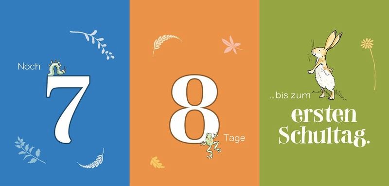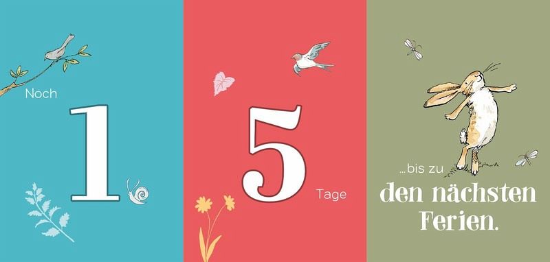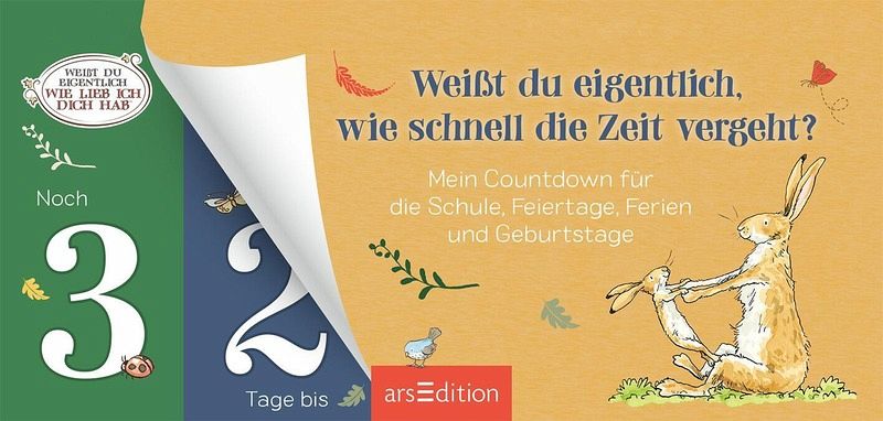 Viele Kinder können die Sommerferien kaum erwarten - und wenn sie vorbei sind, freuen sie sich erst auf die Schule und dann auf Weihnachten. Der geniale Countdown-Kalender mit den weltberühmten "Weißt du eigentlich, wie lieb ich dich hab"-Hasen hilft Schulkindern ab 6 Jahren, spielerisch die Tage bis zu den nächsten wichtigen Ereignissen im Jahr zu zählen. Der praktische Tischaufsteller ist in drei Teile geteilt, die sich ganz einfach umklappen lassen: Die beiden linken Teile zeigen die verbleibenden Tage, der rechte Teil wichtige Anlässe wie Geburtstag, Schulferien oder Familienfeste. So sehen die Kinder jeden Tag, wie oft sie bis zum nächsten großen Ereignis noch schlafen müssen. Ein schönes Ritual für die ganze Familie!
