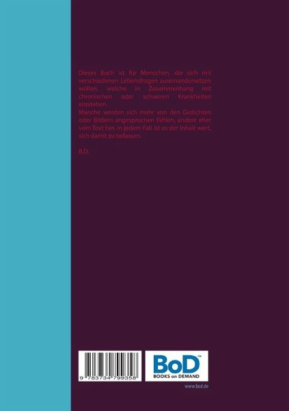 Dieses Buch ist für Menschen, die sich mit verschiedenen Lebensfragen auseinandersetzen wollen, welche in Zusammenhang mit chronischen oder schweren Krankheiten entstehen. Manche werden sich mehr von den Gedichten oder Bildern angesprochen fühlen, andere eher vom Text her. In jedem Fall ist es der Inhalt wert, sich damit zu befassen. B.D.