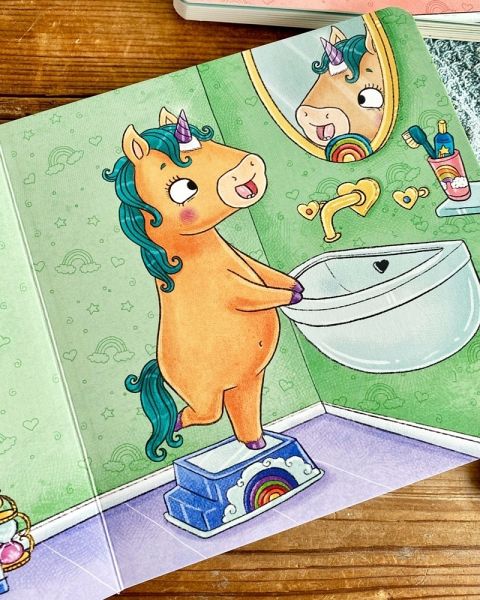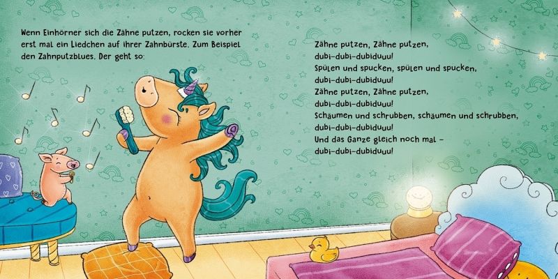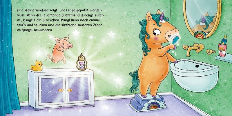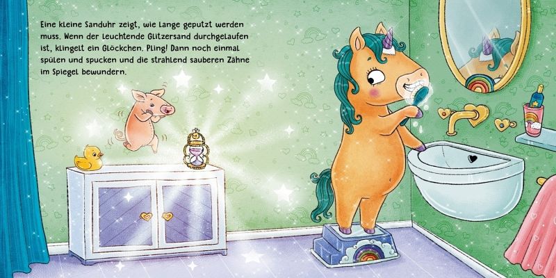 Wie putzen Einhörner eigentlich ihre Zähne? Natürlich mit Elfen-Zahnpasta, extraviel Schaum und dem lustigen Zahnputzblues! Das kleine Einhorn zeigt Kindern ab 2 Jahren, wie seine Zahnbürste aussieht und was es mit dem leuchtenden Glitzersand auf sich hat. Und wenn alle Zähne blitzeblank glänzen? Dann wird natürlich das Horn poliert! Weißt du, warum? So einhorn-tastisch war Zähneputzen noch nie!