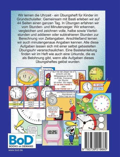 Wir lernen die Uhrzeit - ein Übungsheft für Kinder im Grundschulalter.Gemeinsam mit Basti erleben wir auf 44 Seiten einen ganzen Tag. In Übungen erfahren wir vom Stunden- und Minutenzeiger. Wir erkennen, vergleichen und zeichnen volle, halbe sowie Viertelstunden und addieren und subtrahieren Stunden zur Berechnung von Zeitangaben. Anschließend lernen wir auch minutengenaue Angaben kennen. Alle diese Aufgaben lassen sich mit einer selbst gebastelten Übungsuhr veranschaulichen. Eine Bastelanleitung finden wir im Heft, wie auch eine Urkunde, die es als Belohnung gibt, wenn alle Aufgaben dieses Heftes gelöst wurden.