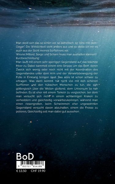 Man stellt sich das so schön vor, so ästhetisch, so eins-mit-dem-Ozean. Die Wirklichkeit sieht anders aus und so stelle ich mir es auch aus der Sicht von meinem Surflehrer vor. Wieviel Mitleid, Sorge und Scham muss man aushalten können? Frage ich mich zunächst, dann sehe ich es bildlich vor mir. Kurzbeschreibung: Man läuft mit einem sehr sperrigen Gegenstand auf das tosende Meer zu. Dabei bammelt einem eine Strippe um das Bein, deren Zweck sich wenig oder noch nicht mit der Koordination des Gegenstandes unter dem Arm und der Vorwärtsbewegung der Füße in Einklang bringen lässt. Das alles ist schon schwer zu ertragen. Was dann kommt, hat nicht viel mit den schönen Surffilmen und den hübschen Menschen zu tun, die sich göttergleich über die Wellen gleitend, dem Universum so nah befinden. Es ist eher mit einem Torkeln zu vergleichen, bei dem man versucht sich nicht in einem achtarmigen Kraken zu verheddern und gleichzeitig vorwärtszukommen, während man einen riesengroßen, beim Schwimmen eher ungewohnten Gegenstand versucht davon abzuhalten, einem die Fresse zu polieren. Gleichzeitig soll man dabei gut aussehen und es irgendwie schaffen das Zeit-Raum-Verhältnis zu überlisten, welches man maximal nutzen muss, um sich nicht an der Leash aufzuhängen, während man das Board im Bruchteil einer Sekunde so unter sich schiebt, dass sich mit der nächsten Weißwasserwelle die physikalische Finesse einer Vorwärtsbewegung erreichen lässt.