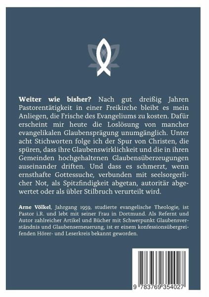 Weiter wie bisher? Nach gut dreißig Jahren Pastorentätigkeit in einer Freikirche bleibt es mein Anliegen, die Frische des Evangeliums zu kosten. Dafür erscheint mir heute die Loslösung von mancher evangelikalen Glaubensprägung unumgänglich. Unter acht Stichworten folge ich der Spur von Christen, die spüren, dass ihre Glaubenswirklichkeit und die in ihren Gemeinden hochgehaltenen Glaubensüberzeugungen auseinanderdriften. Und dass es schmerzt, wenn ernsthafte Gottessuche, verbunden mit seelsorgerlicher Not, als Spitzfindigkeit abgetan, autoritär abgewertet oder als übler Stilbruch verurteilt wird.