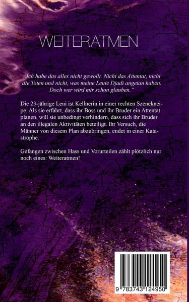 "Ich habe das alles nicht gewollt. Nicht das Attentat, nicht die Toten und nicht, was meine Leute Djadi angetan haben. Doch wer wird mir schon glauben."Die 23-jährige Leni ist Kellnerin in einer rechten Szenekneipe. Als sie erfährt, dass ihr Boss und ihr Bruder ein Attentat planen, will sie unbedingt verhindern, dass sich ihr Bruder an den illegalen Aktivitäten beteiligt. Ihr Versuch, die Männer von diesem Plan abzubringen, endet in einer Katastrophe. Gefangen zwischen Hass und Vorurteilen zählt plötzlich nur noch eines:Weiteratmen!
