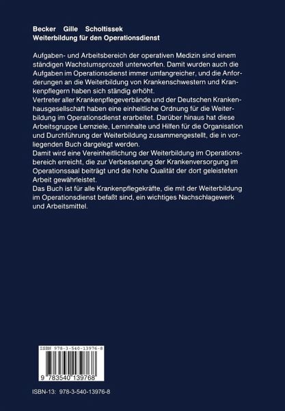 1. Einführung.- 1.1. Muster für eine landesrechtliche Ordnung der Weiterbildung und Prüfung für den Operationsdienst.- 1.2. Anmerkungen zu den einzelnen Paragraphen der DKG-Empfehlung.- 1.3. Leistungsnachweis.- 1.4. Abschlußprüfung und Zeugnisse.- 2. Musterformulare.- 2.1. Anlage zum Teilnahmeantrag.- 2.2. Weiterbildungsvertrag.- 2.3. Leistungsnachweis für verschiedene Operationsbereiche.- 2.4. Stundennachweis.- 2.5. Prüfungsnachweis (Zwischenprüfung).- 2.6. Nachweise für die praktische Unterweisung.- 2.7. Beurteilungsbögen der praktischen Einsätze.- 2.8. Beurteilungs- und Prüfungsbogen der praktischen Weiterbildung für den Operationsdienst.- 2.9. Merkblatt zu Beurteilungsbögen.- 2.10. Zulassungsantrag zur Abschlußprüfung.- 2.11. Niederschrift über die Abschlußprüfung in der Weiterbildung für den Operationsdienst.- 2.12. Zeugnisse, Zertifikate.- 3. Gegenstandskatalog und Lernziele für den theoretischen und praktischen Unterricht zur Weiterbildung und Prüfung von Krankenschwestern, Krankenpflegern und Kinderkrankenschwestern für den Operationsdienst.- 3.1. Gegenstandskatalog für den theoretischen Unterricht.- 3.1.1. Medizinische Grundlagen.- 3.1.2. Pädagogische, soziologische und psychologische Grundlagen.- 3.1.3. Rechtliche, organisatorische und betriebswirtschaftliche Aspekte.- 3. Grundlagen der Pharmakologie und Anästhesie.- 3.1.5. Grundlagen der angewandten Krankenhaushygiene.- 3.2. Lernziele für den theoretischen Unterricht.- 3.2.1. Medizinische Grundlagen.- 3.2.2. Pädagogische, soziologische und psychologische Grundlagen.- 3.2.3. Rechtliche, organisatorische und betriebswirtschaftliche Aspekte.- 3.2.4. Grundlagen der Pharmakologie und Anästhesie.- 3.2.5. Grundlagen der angewandten Krankenhaushygiene.- 3.3. Gegenstandskatalog für denpraktischen Unterricht.- 3.3.1. Praktischer Unterricht und Übungen.- 3.3.2. Praxisgespräche.- 3.4. Lernziele für den praktischen Unterricht.- 3.4.1. Praktischer Unterricht und Übungen.- 3.4.2. Praxisgespräche.- 4. Anhang Operationskatalog für Betriebsvergleiche.- 5. Literatur.