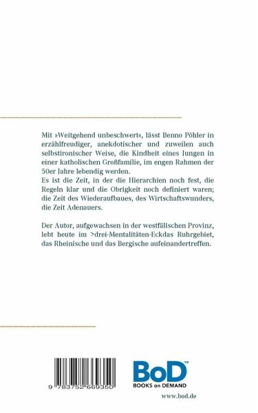 Mit »Weitgehend unbeschwert«, hat der Benno Pöhler eine anekdotische Prosa geschaffen, die in lebendiger, lebensfroher und zuweilen auch selbstironischer Weise, die Kindheit eines Jungen in einer katholischen Großfamilie, im engen Rahmen der 50er Jahre erzählt und lebendig werden lässt. Es ist die Zeit, in der die Hierarchien noch fest, die Regeln klar und die Obrigkeit noch definiert waren; die Zeit des Wiederaufbaues, des Wirtschaftswunders, die Zeit Adenauers.Der Autor, geboren und aufgewachsen in der westfälischen Provinz, lebt heute im rheinischen Ruhrgebiet, da wo sich das Rheinische und das Bergische mit der Ruhr treffen. Weitgehend unbeschwert ist seine erste biografische Veröffentlichung.