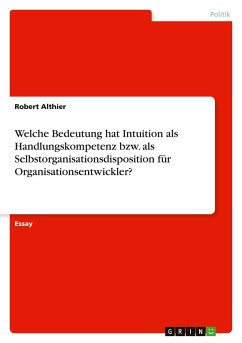 Essay aus dem Jahr 2014 im Fachbereich Organisation und Verwaltung, Note: 1,3, Rheinland-Pfälzische Technische Universität Kaiserslautern-Landau (DISC), Veranstaltung: Studiengang Organisationsentwicklung, Sprache: Deutsch, Abstract: Von Management und Organisationsentwicklern wird meist verlangt, "rationale Entscheidungen zu treffen". Dennoch äußern Entscheider überraschend oft, "aus dem Bauch heraus" zu agieren. Ist Intuition möglicherweise eine sinnvolle komplementäre Ergänzung der bestehenden Handlungskompetenzen? Das vorliegende Essay geht dieser Fragestellung nach. Zu der seit Jahren stattfindenden Entwicklung des Kompetenzbegriffes schreitet parallel die Etablierung von Intuition im Alltag interner und externer Organisationsentwickler voran. Hier werden nun die Anknüpfungspunkte beider Entwicklungsstränge durch die Darlegung eines aktuellen Verständnisses von Kompetenz und Intuition dargelegt. Sowohl die für Organisationsentwickler relevanten Funktionen von Intuition, als auch deren Grenzen werden erörtert, um dann in einem abschließenden Resümee die Bedeutung von Intuition als Selbstorganisationsdisposition für die Organisationsentwicklung darzustellen.