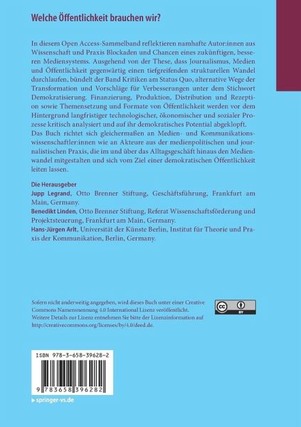 Strukturwandlungen der Öffentlichkeit. Herausforderungen für die Demokratie.- Wann ist Öffentlichkeit demokratisch(er)?.- Working Class, Frauen, Minderheiten: Angemessene mediale Repräsentation als demokratischer Auftrag.- Wer macht Medien? Zum Zustand der Diversität in den Medienhäusern.- Die Finanzierung von Journalismus heute und morgen: Vor- und Nachteile verschiedener Finanzierungsmodelle.- Wer beherrscht die Medien? Wie Eigentumskonzentration, Medienvielfalt und Demokratie zusammenhängen.- Interoperabilität, Plattform-Kooperativismus oder Kontrolle der Algorithmen: Wie technische Infrastruktur die Demokratisierung der Medienlandschaft fördern könnte.- Demokratisierungsmöglichkeiten des Öffentlich-Rechtlichen Rundfunks.- Medienvertrauen und welches Verhältnis Medien zu ihrem Publikum einnehmen (sollten).- Die Bedeutung von Medienkompetenz für den demokratischen Diskurs.- Europas Krisen und das Versagen der Medien - die überfällige Europäisierung des Journalismus.- Europas Krisen und das Versagen der Medien - die überfällige Europäisierung des Journalismus.