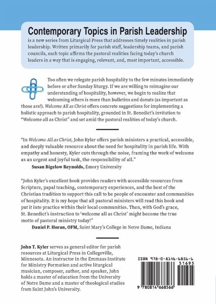 Contemporary Topics in Parish Leadership is a series from Liturgical Press that addresses timely realities in parish leadership. Written primarily for parish staff, leadership teams, and parish councils, each topic affirms the pastoral realities facing today's church leaders in a way that is engaging, relevant, and, most important, accessible. Short chapters grounded in real-world experiences invite readers to consider the depth of pastoral realities from a scriptural, theological, and ministerial perspective. "Questions for Reflection" and "Continuing the Conversation" at the end of each chapter encourage personal reflection, group discussion, and suggestions for practical implementation in today's diverse parishes. Too often we relegate parish hospitality to the few minutes immediately before or after Sunday liturgy. If we are willing to reimagine our understanding of hospitality, however, we begin to realize that welcoming others is more than bulletins and donuts (as important as those are!). Welcome All as Christ offers concrete suggestions for implementing a holistic approach to parish hospitality, grounded in St. Benedict's invitation to "Welcome all as Christ" and set amid the pastoral realities of today's church.