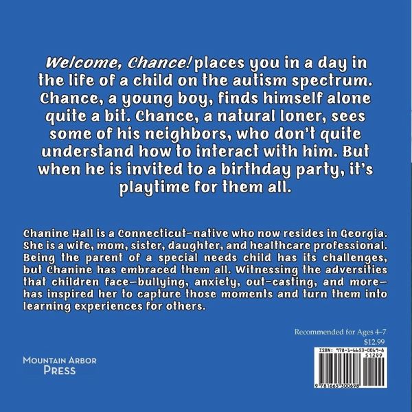 Welcome, Chance! places you in a day in the life of a child on the autism spectrum. Chance, a young boy, finds himself alone quite a bit. Chance, a natural loner, sees some of his neighbors, who don't quite understand how to interact with him. But when he is invited to a birthday party, it's playtime for them all.