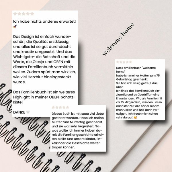 OBEN wurde 2023 von Olesja gegründet, um mit analogen Produkten wie Journals, Familienbüchern und Planern Menschen zu inspirieren, sich bewusster mit ihren Gedanken, Wurzeln und Zielen auseinanderzusetzen. Die Marke steht für Selbstreflexion, Dankbarkeit und persönliches Wachstum und lädt dazu ein, in einer digitalen Welt innezuhalten. Nach über zehn Jahren als Beauty-Influencerin hat sie gespürt, dass es Zeit für etwas Neues ist. Die Unterstützung ihrer Community hat sie inspiriert, etwas Nachhaltiges zurückzugeben und den Fokus von äußerer Schönheit auf mentale Gesundheit, innere Stärke und Selbstliebe zu richten. Mit ihren Büchern schafft sie Raum für echte Reflexion - für sich selbst oder im Austausch mit anderen. Schreiben ist eine unterschätzte Superkraft, die ihr geholfen hat, Gedanken zu sortieren und Klarheit zu finden. Die Bücher laden dazu ein, nicht nur den Alltag festzuhalten, sondern sich tiefgehenden Fragen zu widmen: Was will ich wirklich? Was hält mich zurück? Wo liegen meine Stärken? OBEN fördert Wachstum - beruflich und privat - und ermutigt dazu, auch unbequeme Themen anzugehen. Wahres Glück entsteht, wenn man sich selbst kennt und zu seinem besten Freund wird. In einer Welt voller Ablenkungen rückt OBEN das Wesentliche in den Fokus: Zeit, Beziehungen, Achtsamkeit und Selbstbewusstsein. Mit dem Leitspruch "Wurzeln stärken, um zu fliegen" verbindet OBEN tiefgehende Reflexion mit durchdachten Tools für den Alltag.